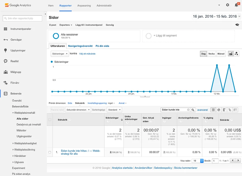 I Google Analytics kan man hitta specifika sidor på flera sätt. På denna bild är en sökning på sidtitel gjord för att hitta just träffar på 404-felsidan.