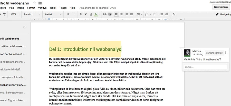 Värt att notera är att man brukar få mejl när någon skrivit till ens kommentar, eller godtagit en ändring. Är man lagd åt att inte vilja ha en massa mejl så fixa gärna en e-postregel som stuvar undan dessa mejl i en särskild mapp i mejlen.