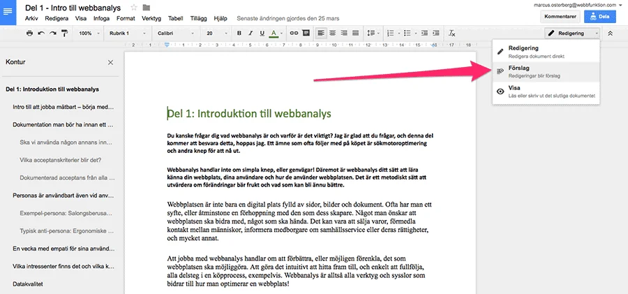 När man väl gjort den inställningen blir de saker man skriver i själva dokumentet förslag på ändringar, då kan både du och jag se hur det såg ut och vad du föreslår. Annars kan man nöja sig med att markera text och skriva en kommentar.