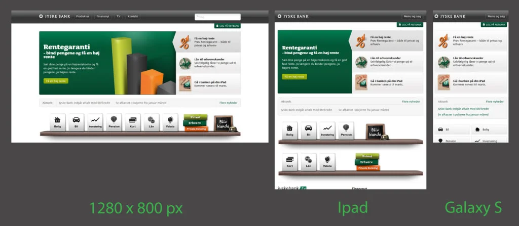 Jyske Bank (www.jyskebank.dk) tipsade en kollega mig om. De har verkligen lyckats väl med att bevara sitt varumärke och har många steg inställda i sina media queries - något många andra slarvar med trots att det på inget sätt är givet exakt hur bred en webbläsare är idag. Man har svårt att föreställa sig att de kör samma system bakom kulisserna, Websphere Portal Server (www.ibm.com/software/websphere/portal/) från IBM, som Göteborg Stads välförtjänt utskällda, kostsamma och misslyckade prestigeprojekt.