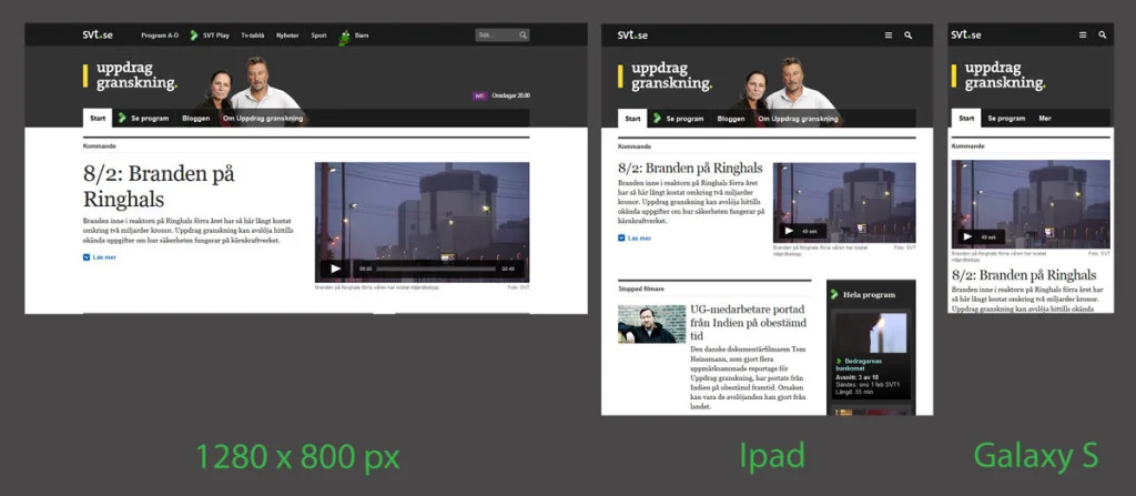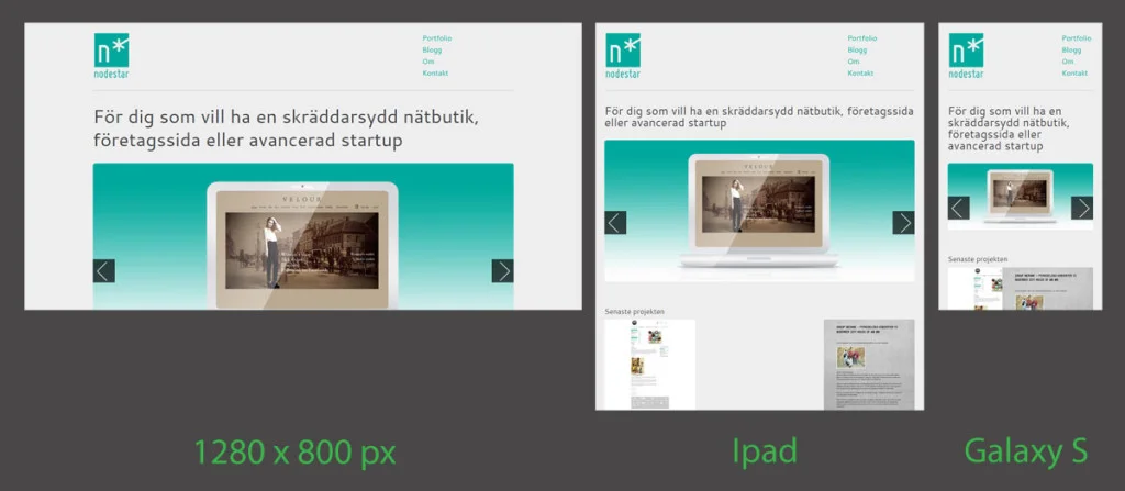 Nåväl, hittade några bra nordiska exempel i alla fall. Exempelbilderna nedan är gjorda i upplösningarna 1280x800 som var vanligast globalt under 2011, 768x1024 som är en Ipad stående och 400x800 som mobilen Samsung Galaxy S kör med stående. Klicka på respektive bild för en förstoring.