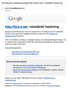 Det finns en poäng i att registrera sig och sin webbplats i tjänsten Google Webmaster Tools. Då kommer du får ett hjälpsamt mejl om Google upptäcker att något inte står rätt till. Se bildexempel på hackning som Google upptäckt här intill.